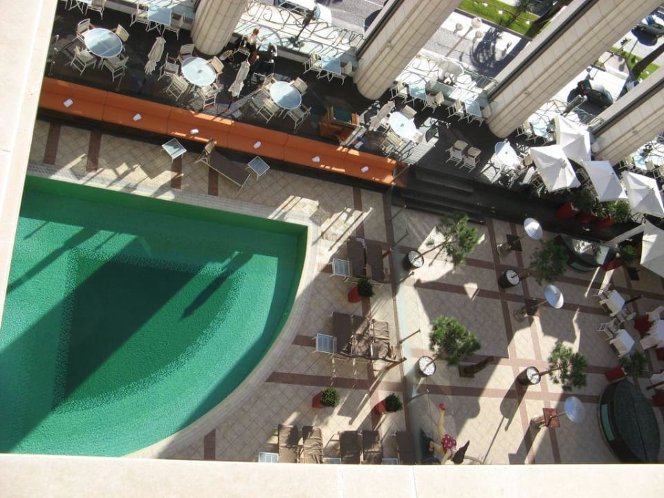 Hotel Palais de la Mediterranee in Nizza: Blick vom Balkon im obersten Stockwerk auf die Restaurant-, Bar- und Swimmingpoolebene im 3. Stock