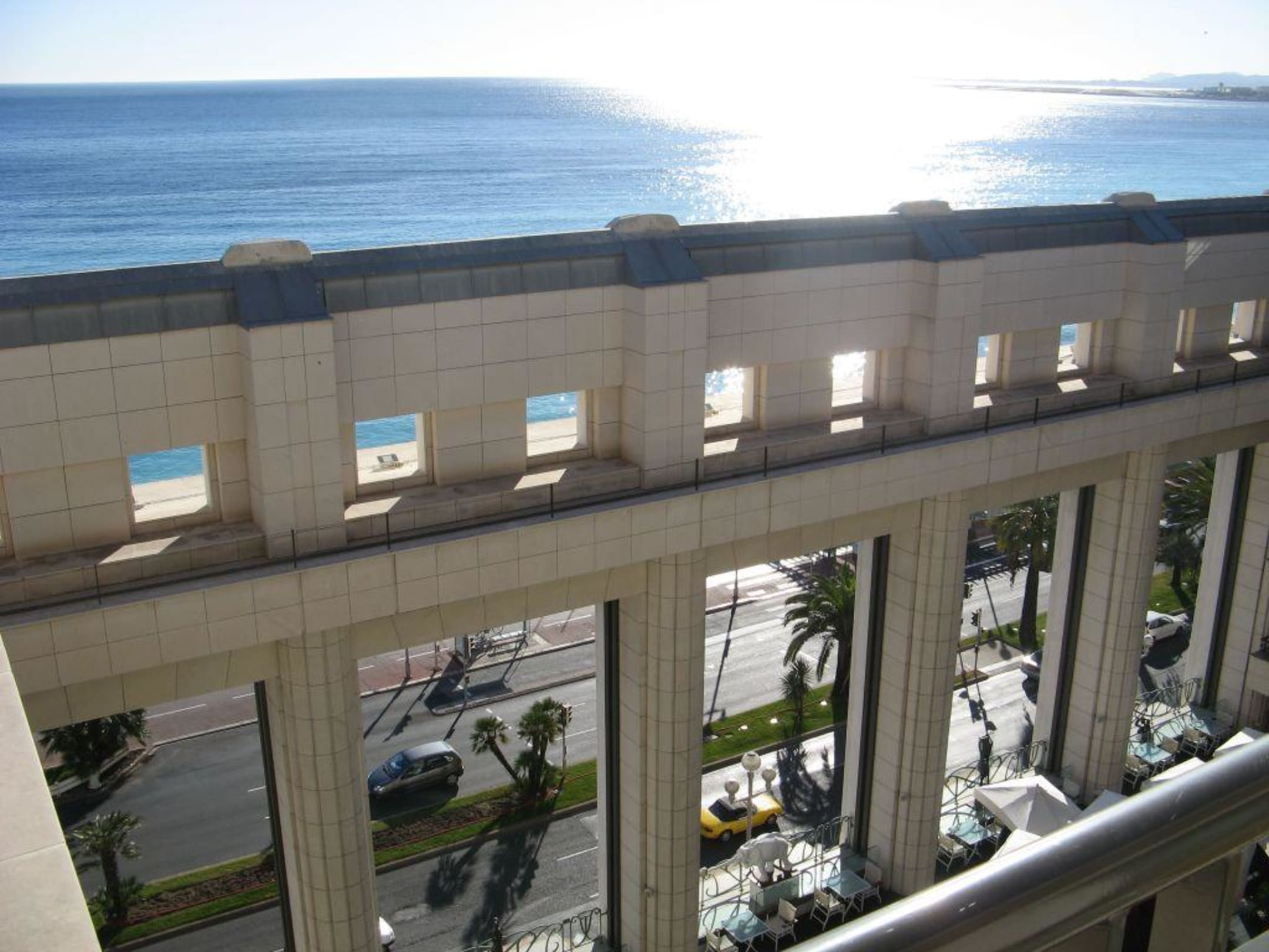 Hotel Palais de la Mediterranee in Nizza: Blick vom Balkon im obersten Stockwerk auf den Hotelvorbau, der die Sicht aufs Meer beeinträchtigt