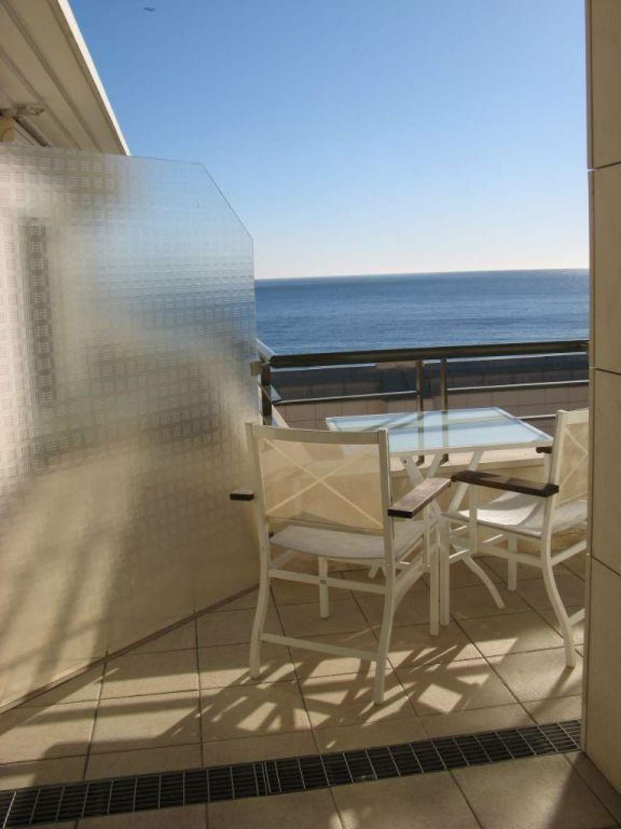 Hotel Palais de la Mediterranee in Nizza: Balkon mit schönem Ausblick aufs Meer, die Abgrenzungen zu den angrenzenden Balkonen bieten jedoch keinen richtigen Sichtschutz