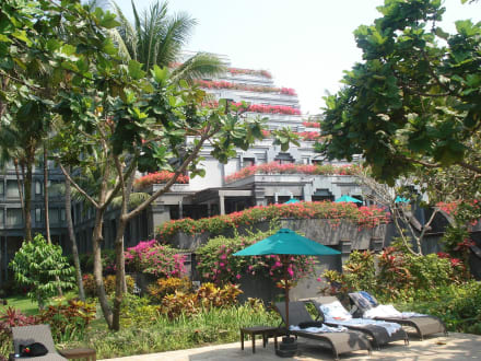 Blick vom Pool zum Hotel