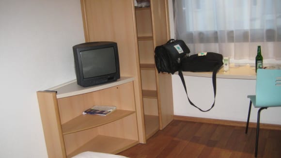 Zimmer mit Blick auf den FernsehapperatDas Bild zeigt den Fernsehapperat und einen Teil des Ablagebrettes im Zimmer des Hotels