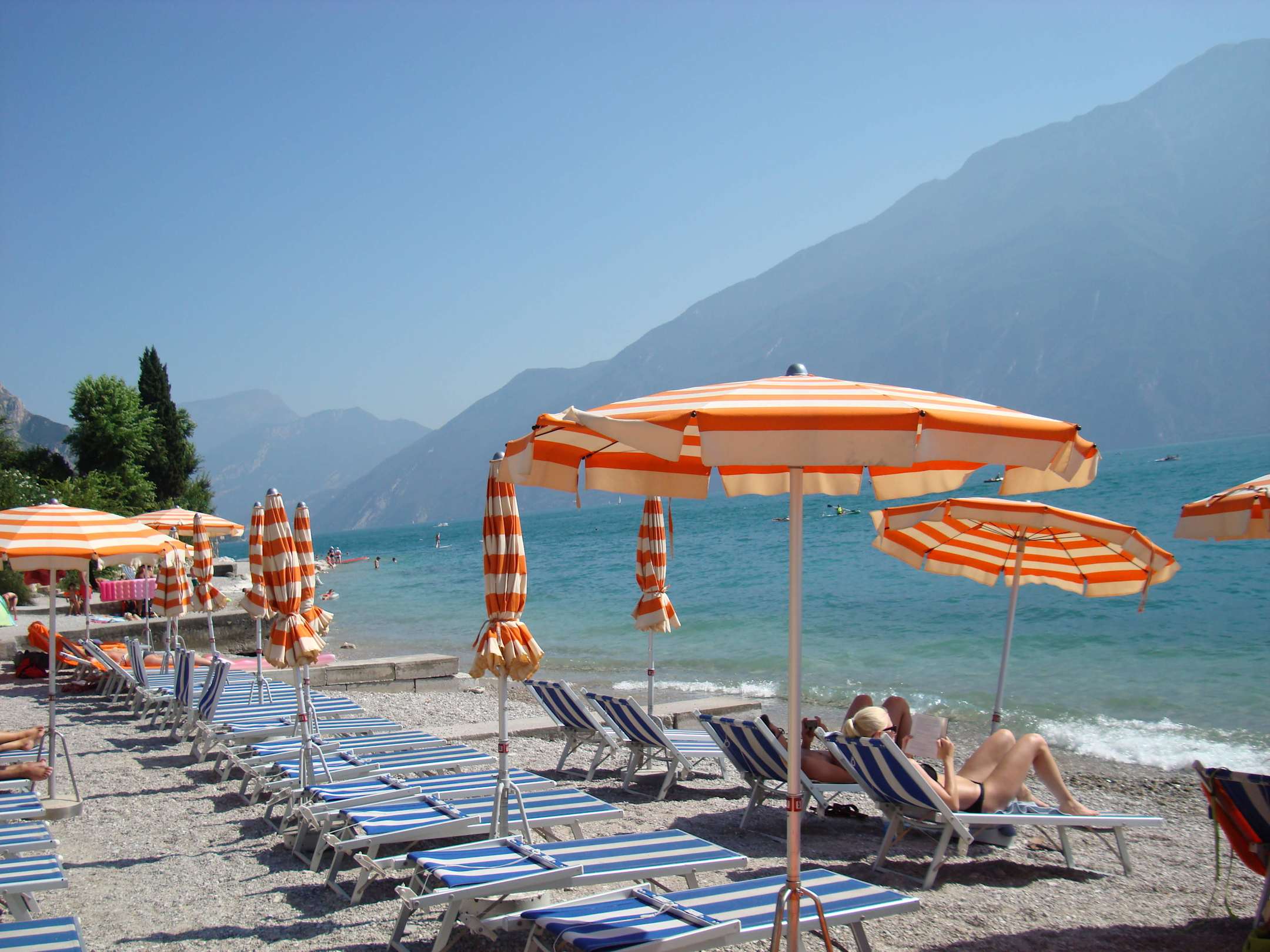 Liegen und nummerierte Sonnenschirme