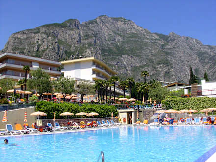 Blick vom See auf Pool und Hotel