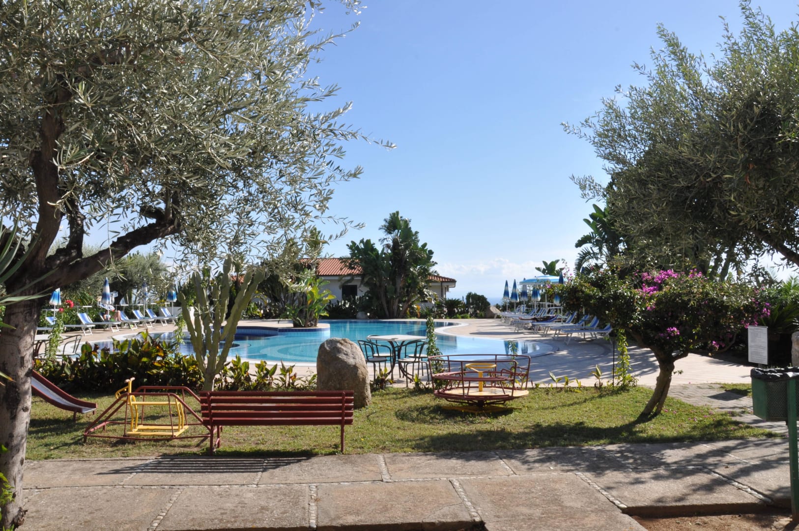 Blick vom Hauptgebäude auf die Poolanlage