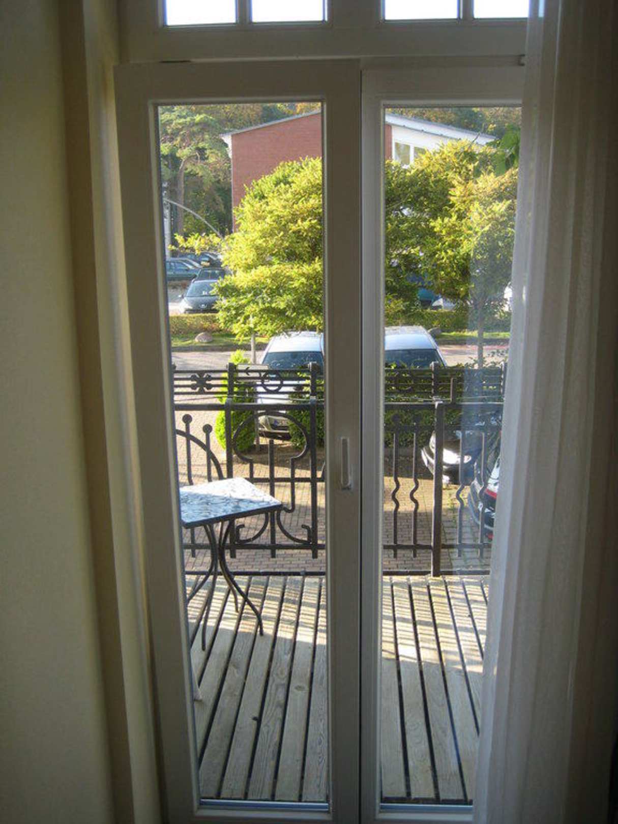 Blick aus dem Zimmerfenster auf den Balkon