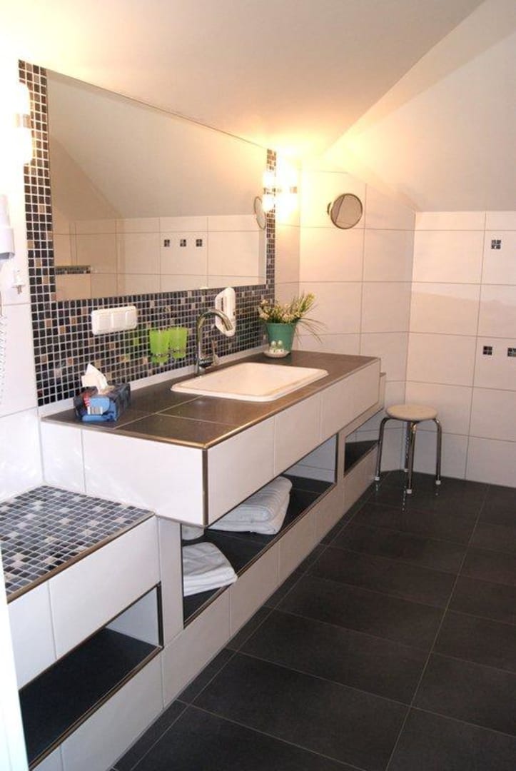 Unser Bad war sehr geräumig mit viel Ablageflächen