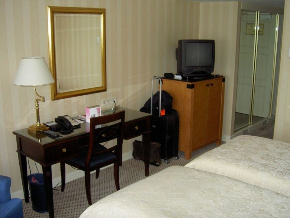 Schreibtisch, kleiner Fernseher und Minibar im Hotel Interconti in Wien