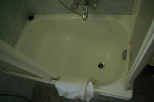 Die Mini-Duschwanne. Im rechten Bereich ist die Wanne tiefer, es passen gerade so zwei Füße in Schuhgröße 39 nebeneinander hin. Der Sinn dieser Konstruktion hat sich mir nicht erschlossen, man kann weder vernünftig baden noch duschen.