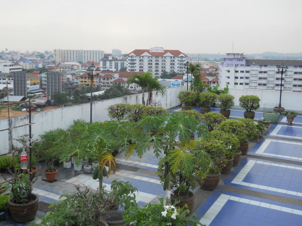 Blick auf die Dachterrasse neben dem Pool.