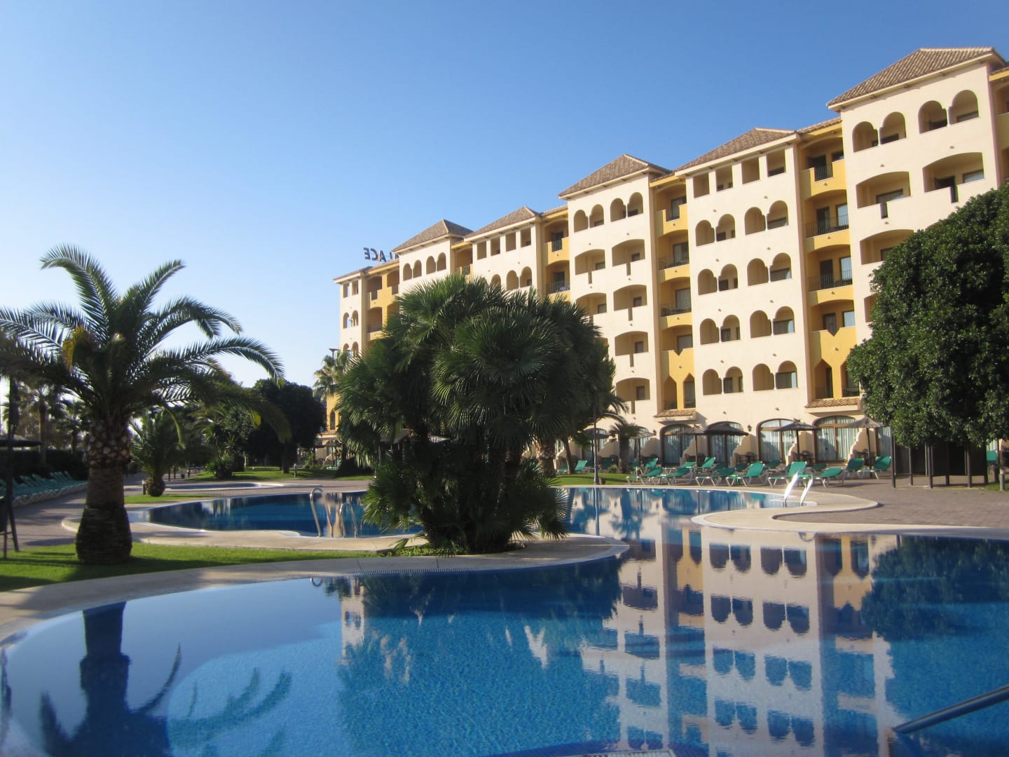Blick über den Pool zum Hotel (vormittags)