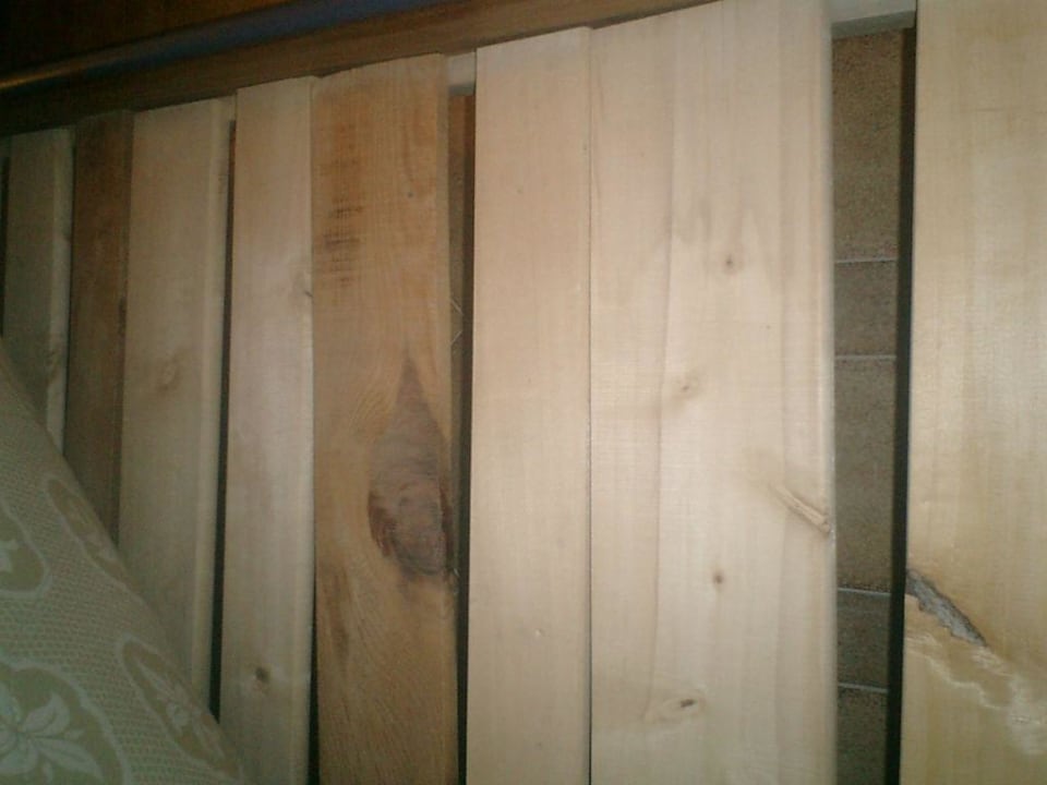 Alte Bretter anstatt LattenrostZu sehen: Unterschiedlich große alte Holzbretter, anstelle eines Lattenrostes auf denen wir schliefen...