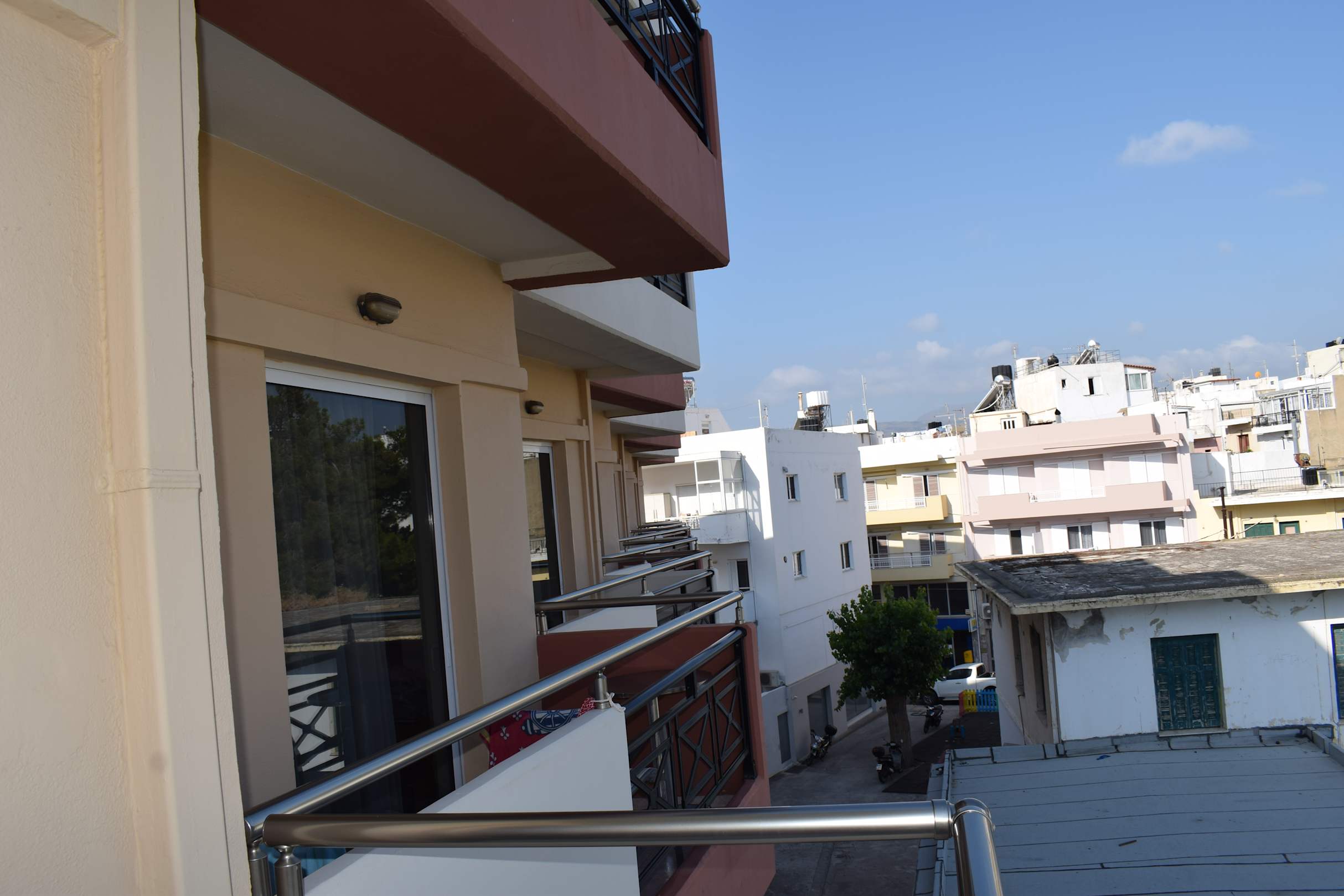ZimmerBlick vom Balkon nach links (dies ist ein Zimmer mit "Gartenblick", der meint aber den kleinen öffentlichen Park, den man hier nicht sieht)
