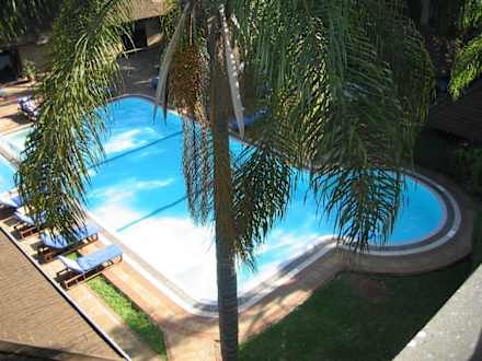Blick vom Zimmer auf den Pool