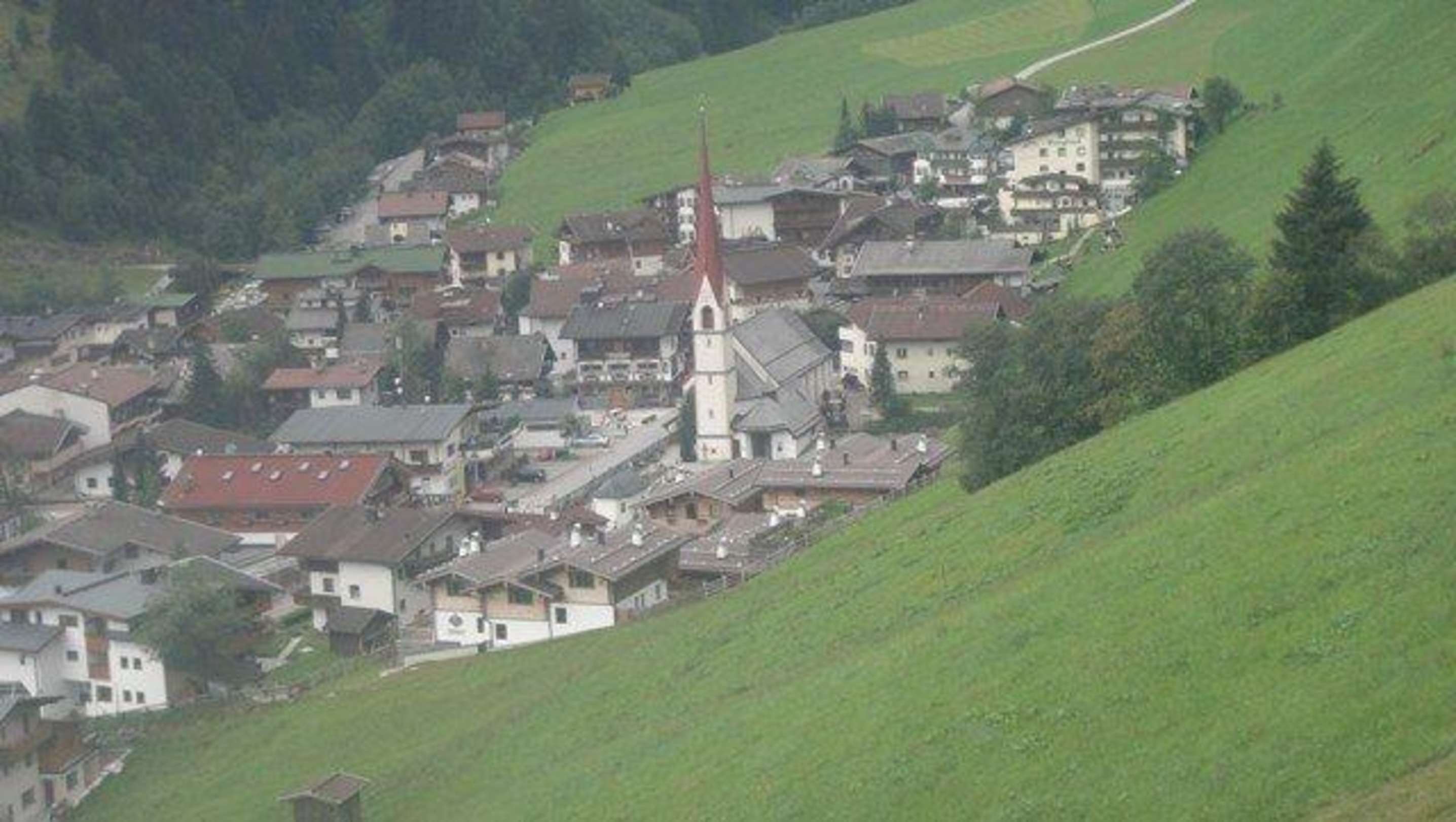 Blick von der Eggalmseilbahn auf Lahnersbach; im Hintergrund der Hotelkomplex Jäger