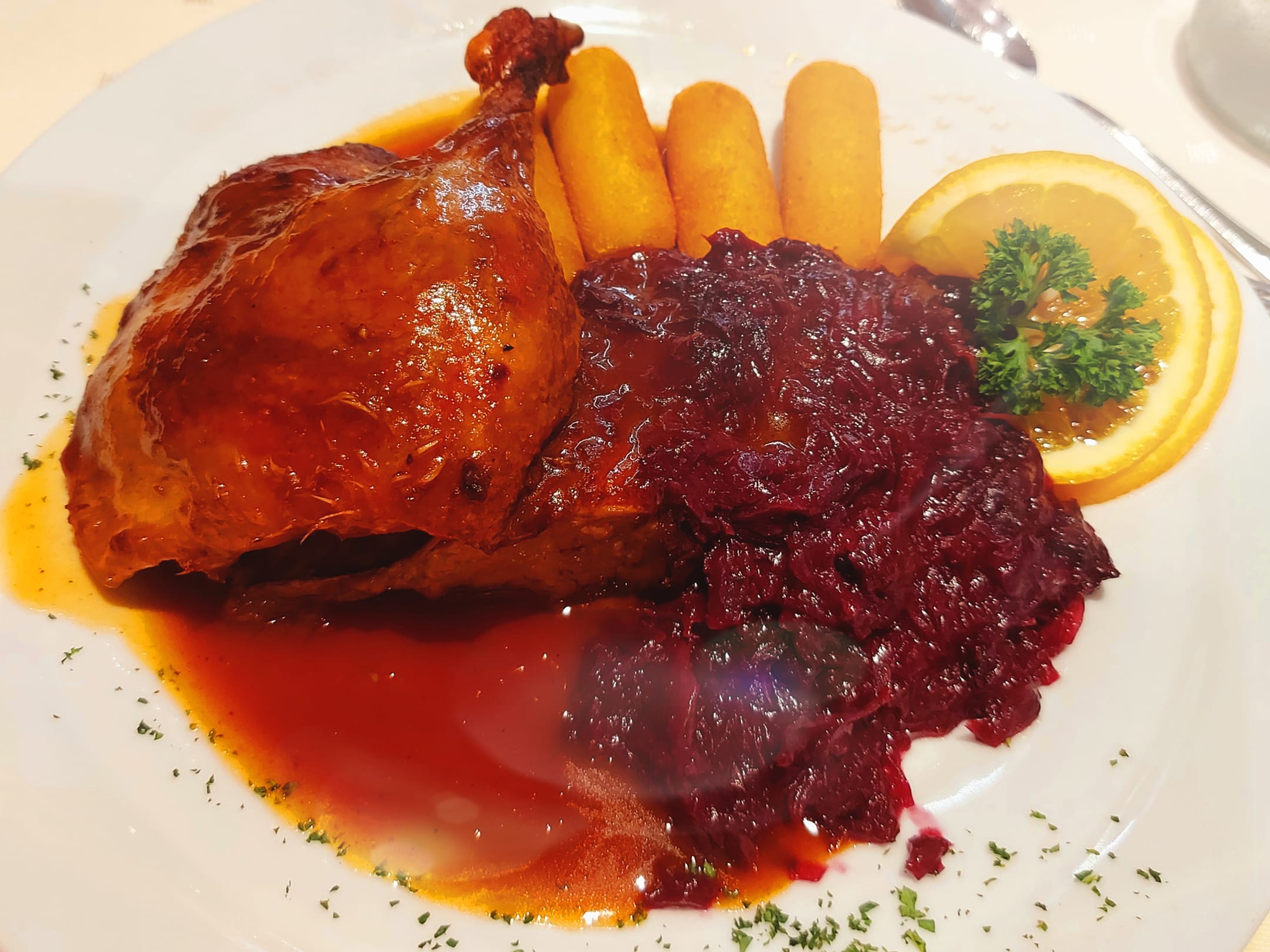 GastroOfenfrische Ente an Orangen-Glace mit Preiselbeer-Rotkraut und Kroketten ... einfach nur spitze!