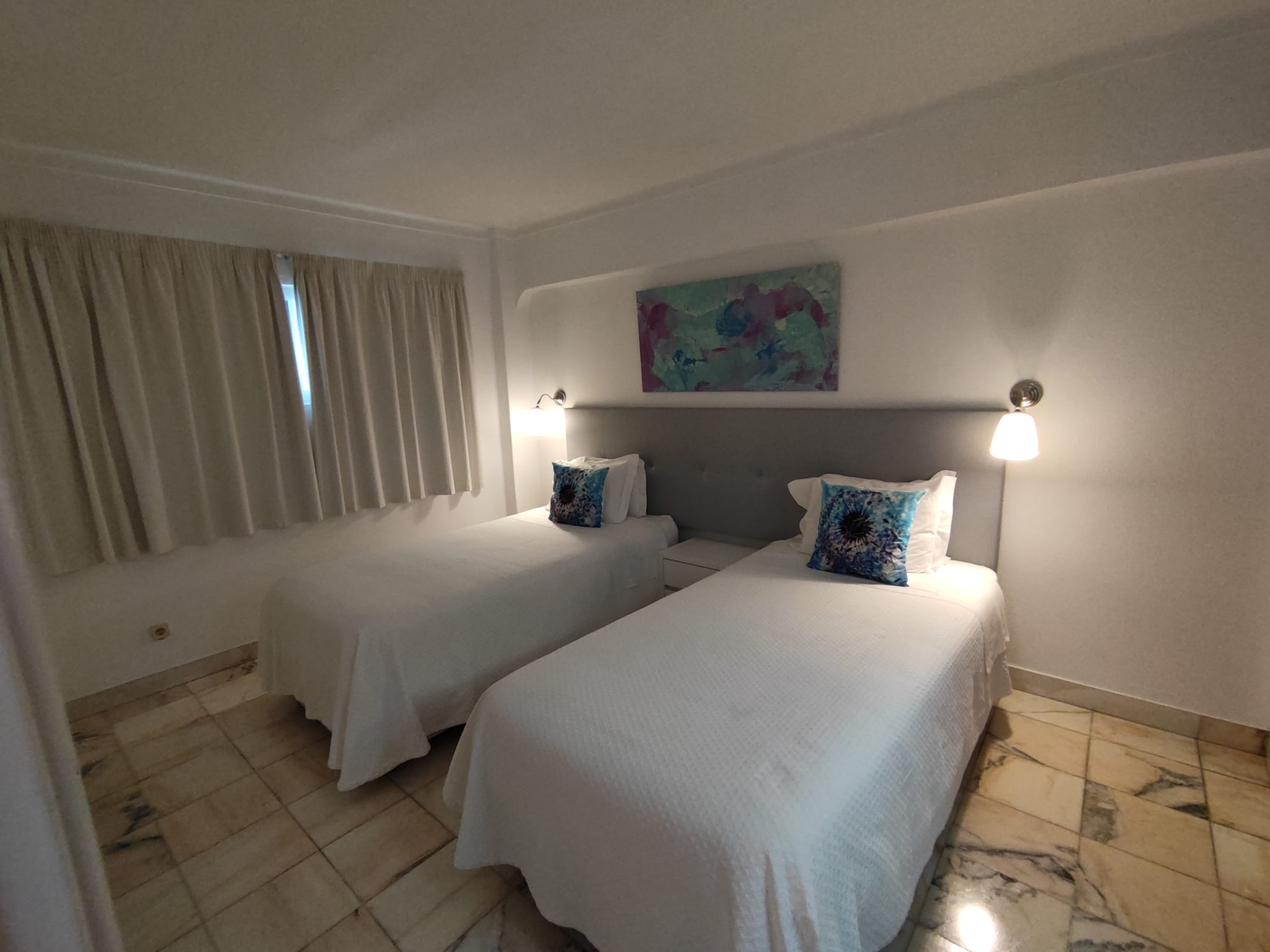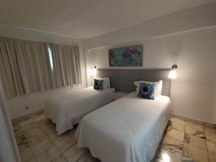 ZimmerSchlafzimmer. Betten können zusammen geschoben werden. Mit Einbauschrank, Schminktisch,Klimaanlage/Heizung