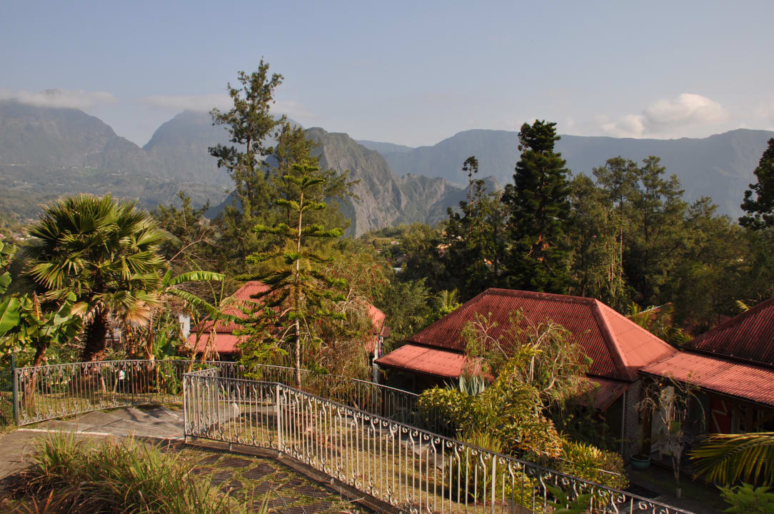 Aussicht von der Restaurant-Terrasse auf die Bungalows und die umliegenden Berge