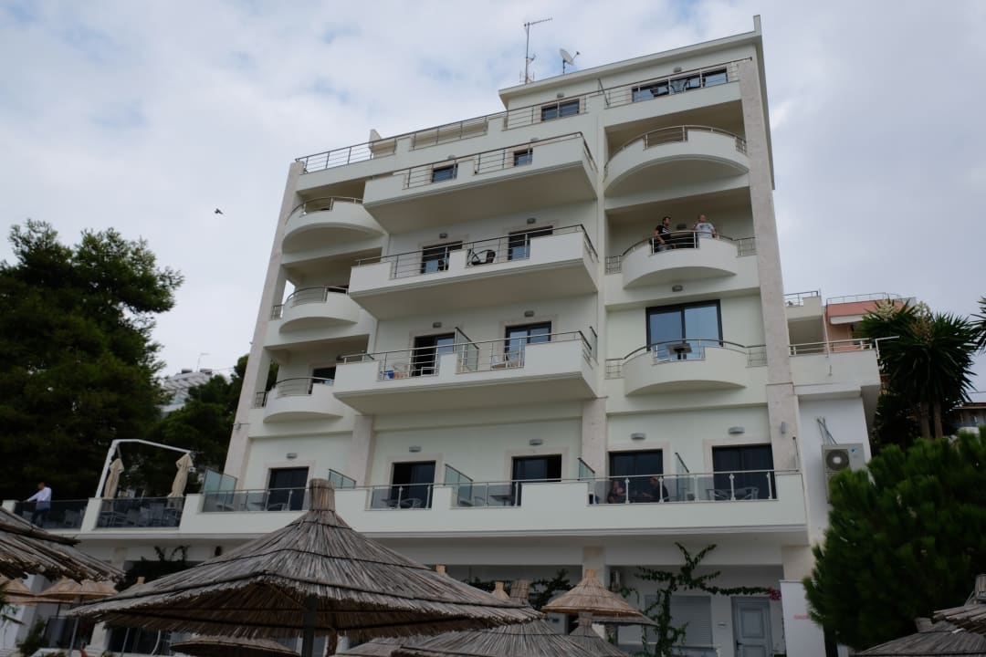 Hotel vom Strand fotografiert. Unten Terassen