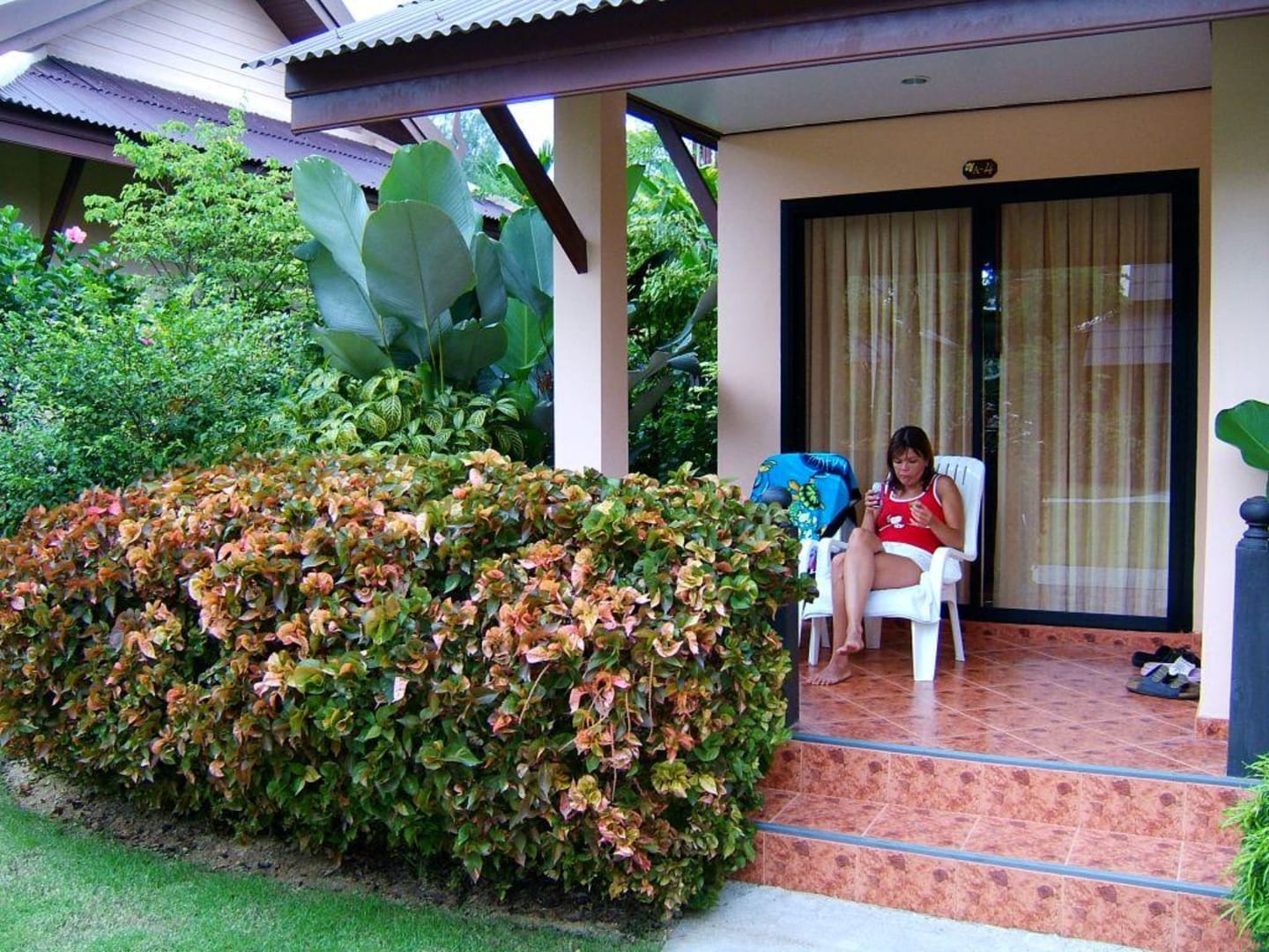 Pflanzungen um alle BungalowsEin liebevoll angelegter und ständig gepflegter Garten mit herrlichen Pflanzungen und Blüten. Auch alle Bungalows sind eingebettet von Pflanzen und die Terassen vom Nachbarbungalow nicht einsehbar. Hier kann man auf der Terasse relaxen und in den Abend- oder Morgenstunden dem Vogelgezwitscher lauschen.