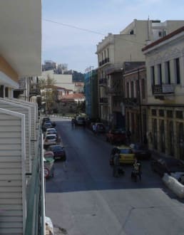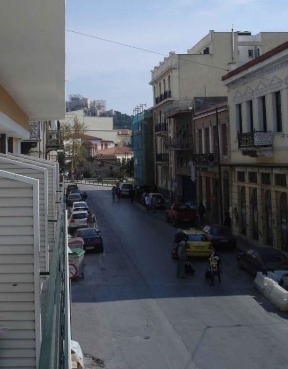Blick vom Balkon unseres Zimmers ( 1. Stock) Im Hintergrund Teile der Akropolis.