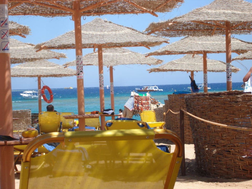 Hier sind die dicht gedrängten Sonnenschirme und Liegen zu sehen, im Hintergrund ein Kamel, auf dem man unter Führung eines Einheimischen am Strand entlang reiten kann.