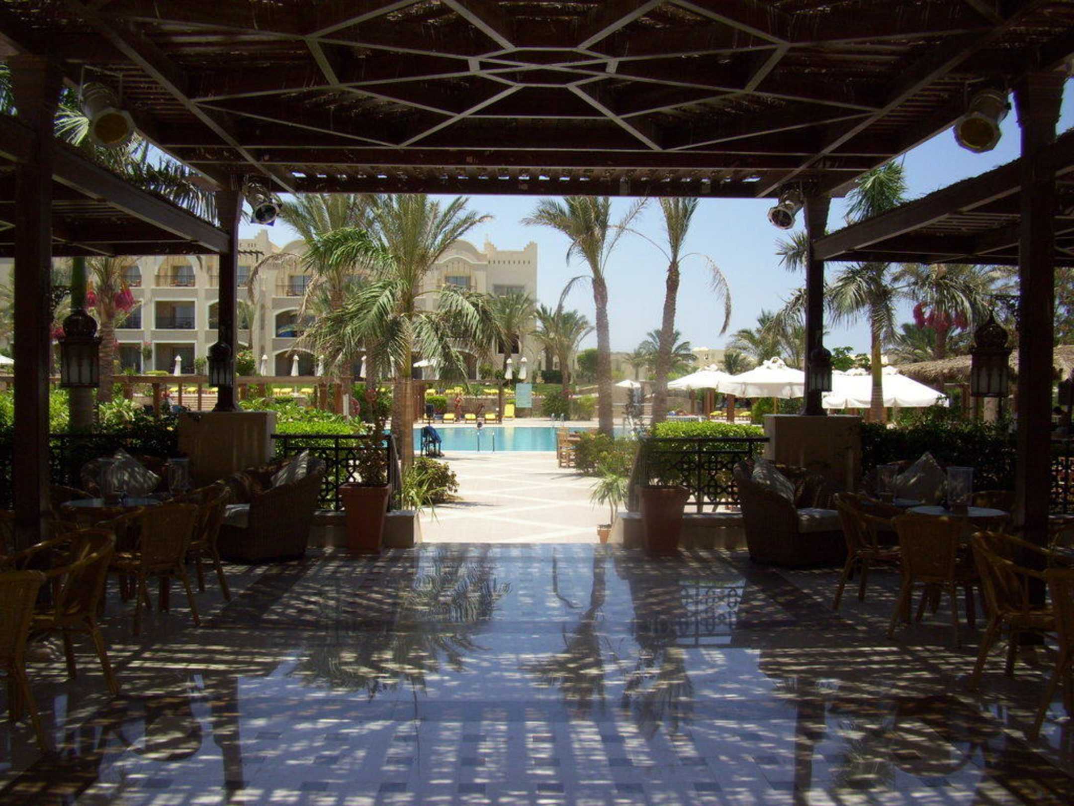 Blick vom Lobbyausgang auf die Poolanlage