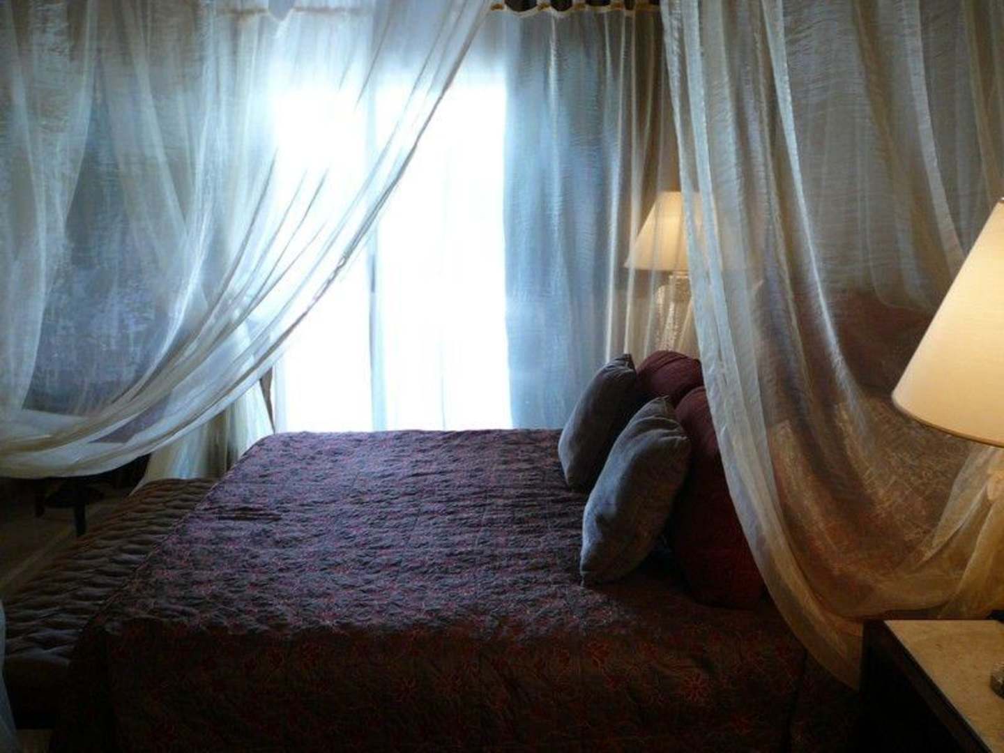 Leider konnten wir uns das nicht leisten: das elegante Himmelbett in einer der Suiten. Dahinter gehts nach draussen. Nach dem Aufstehen kann man also direkt in den eigenen kleinen Pool. Hauptsache!