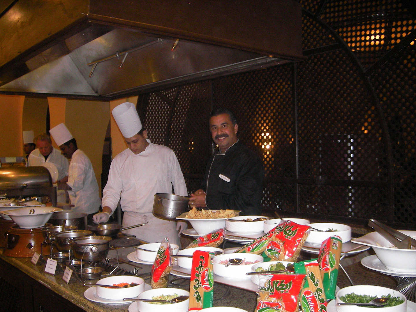 Chefkoch mit köchen an der pastatheke