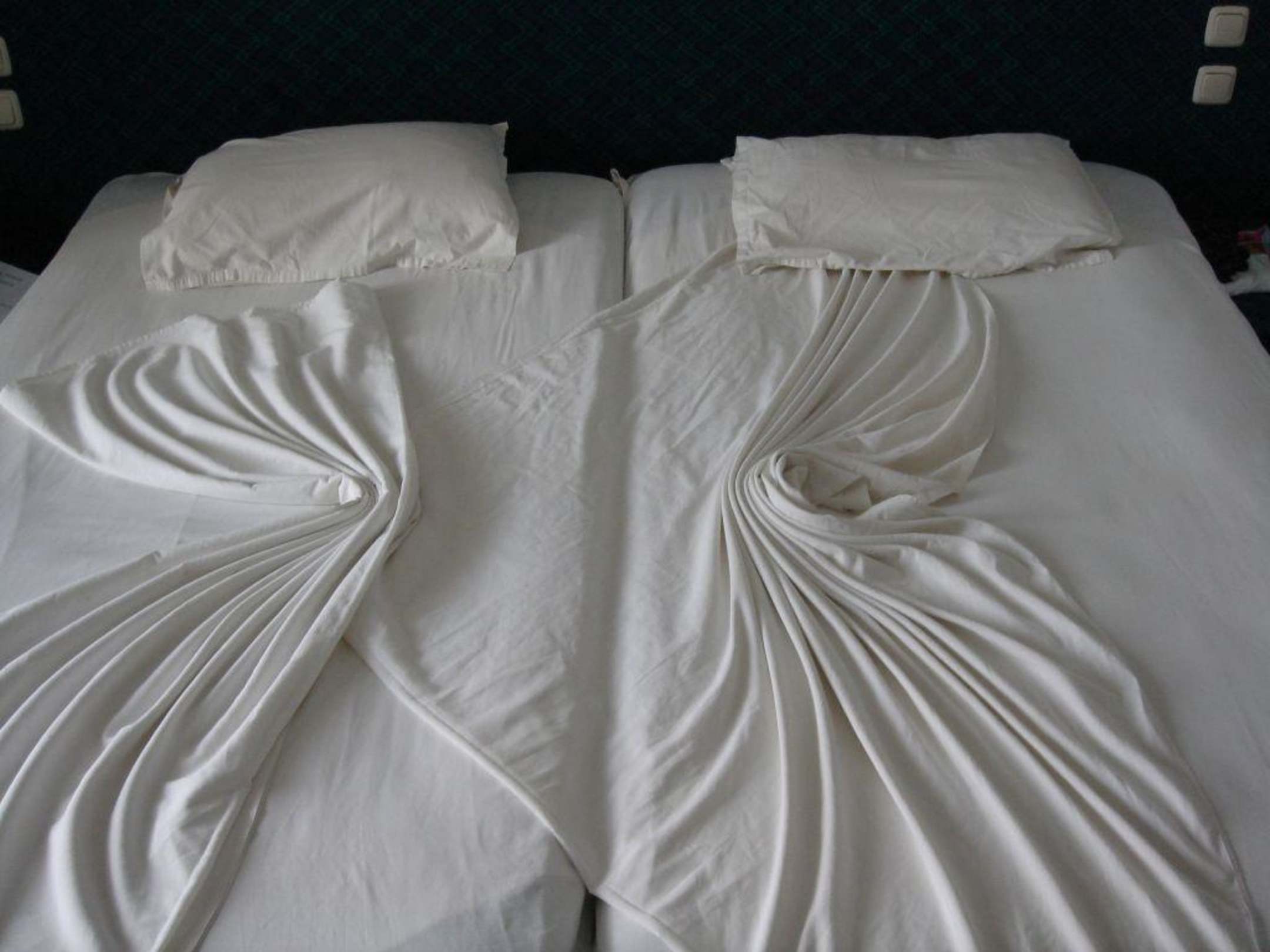 So sieht ein Bett aus, wenn man dem Zimmermädchen hin und wieder mal etwas Trinkgeld gibt. Sie zeigen sich mit solchen Dekorationen und Blumen dankbar