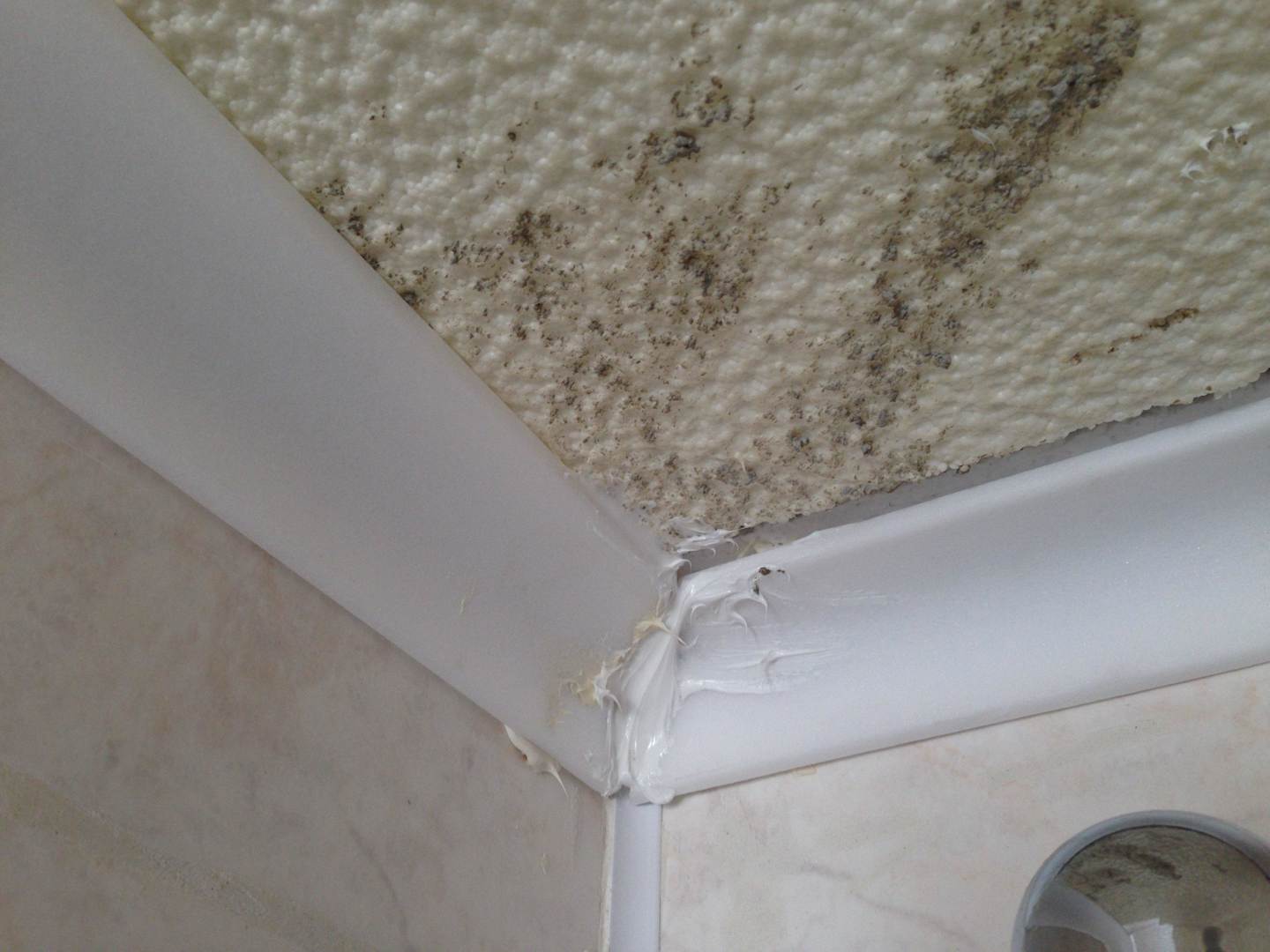 DuscheSilikon Improvisationen umspielen sowohl die Styropor Deckenplatten, das Waschbecken sowie die individuell angebrachten Fließen.