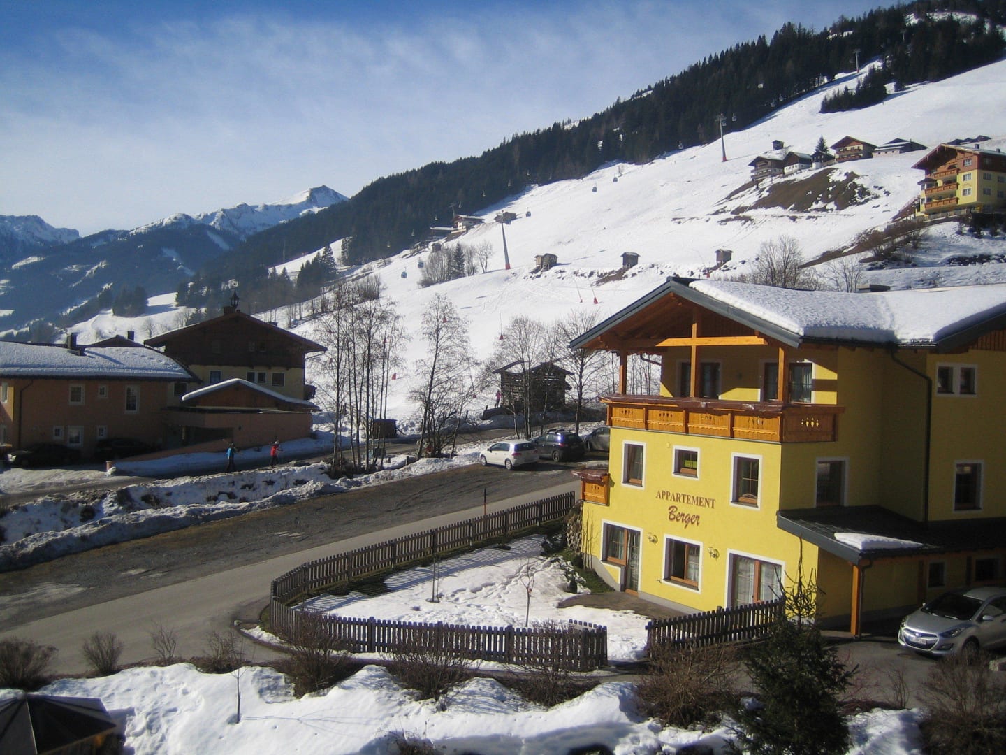 Blick vom Balkon zum Einstieg ins Skigebiet