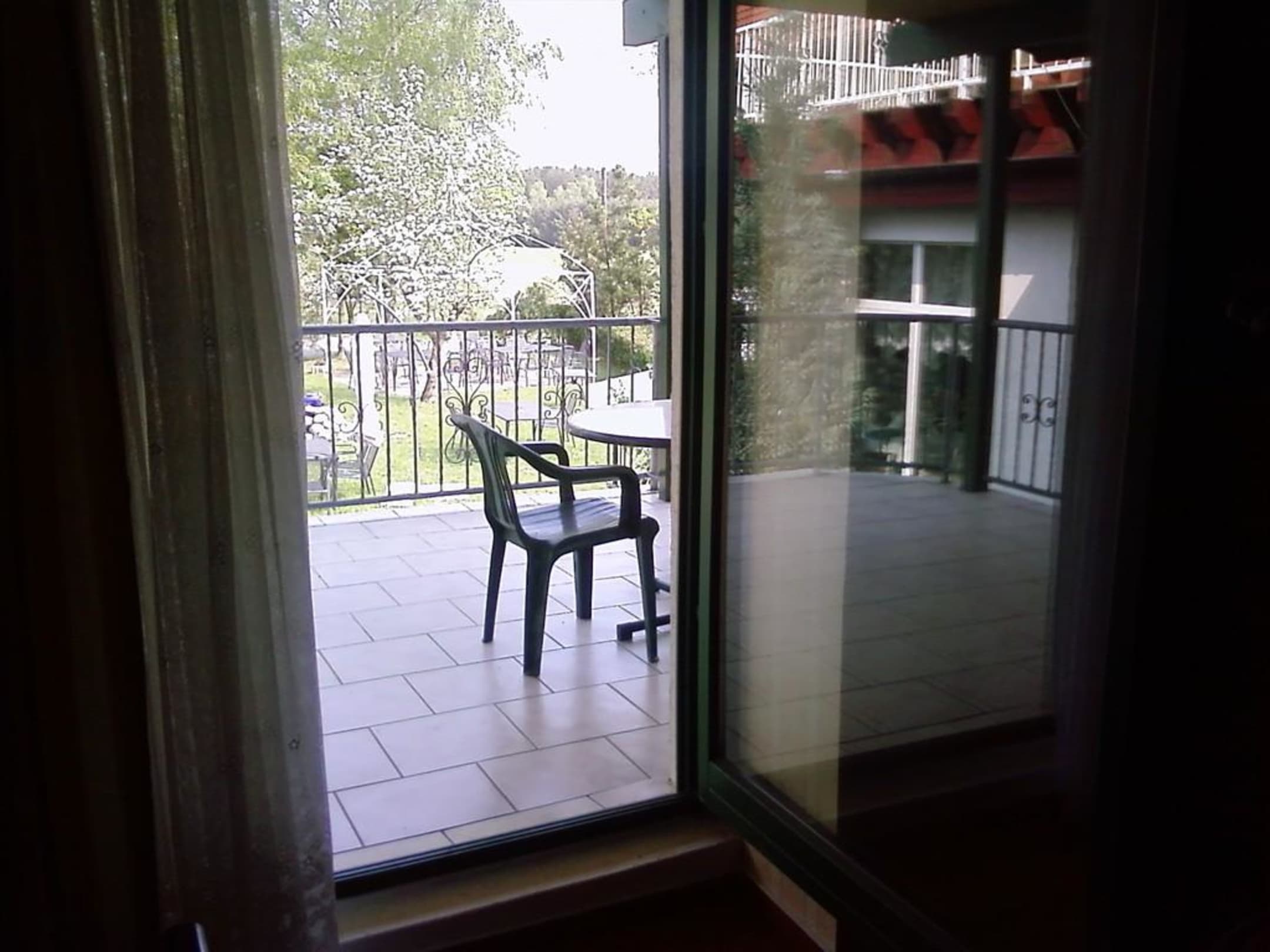 Blick vom Zimmer über Terrasse in Garten