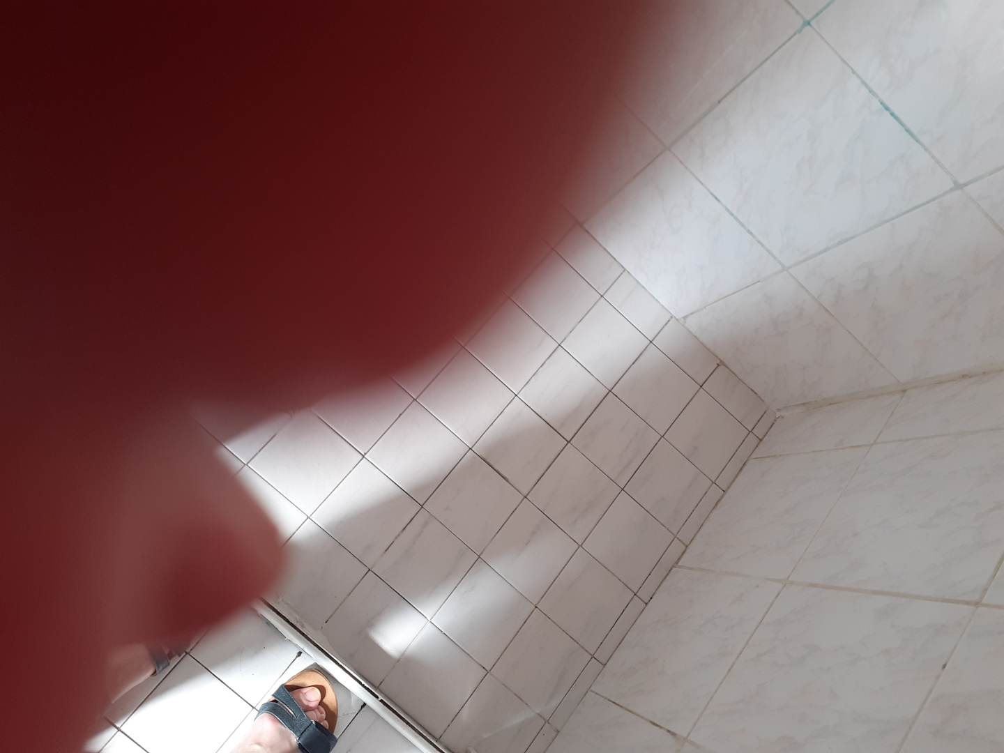 Dusche mit Schimmel und verbeulten Abfluß in gesplitterten Fliesen