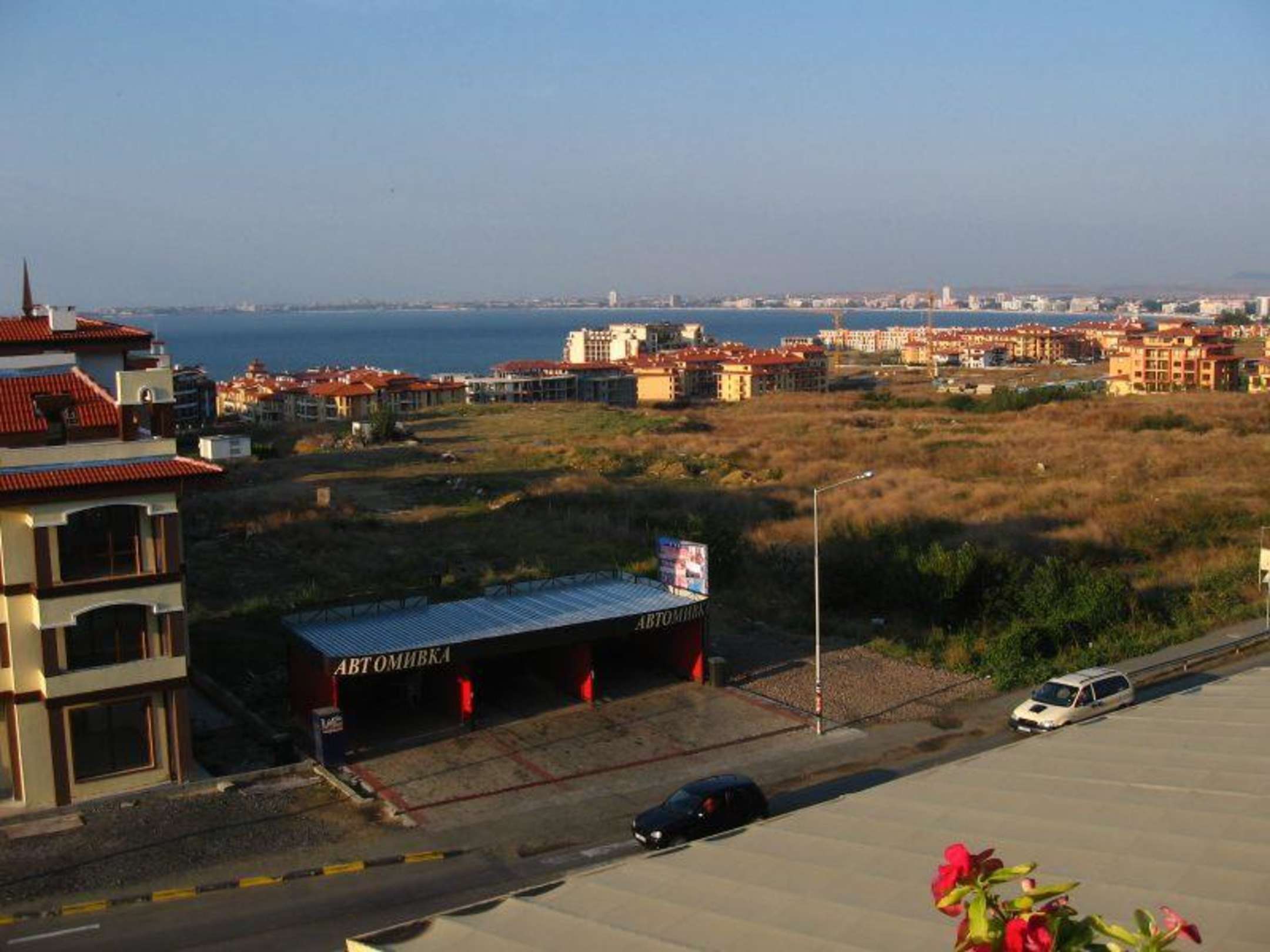 Widok z balkonuWidcozna na pierwszym planie myjnia - jeden z nielicznych minusów hotelu. W tle widać wybrzeże Słonecznego Brzegu.