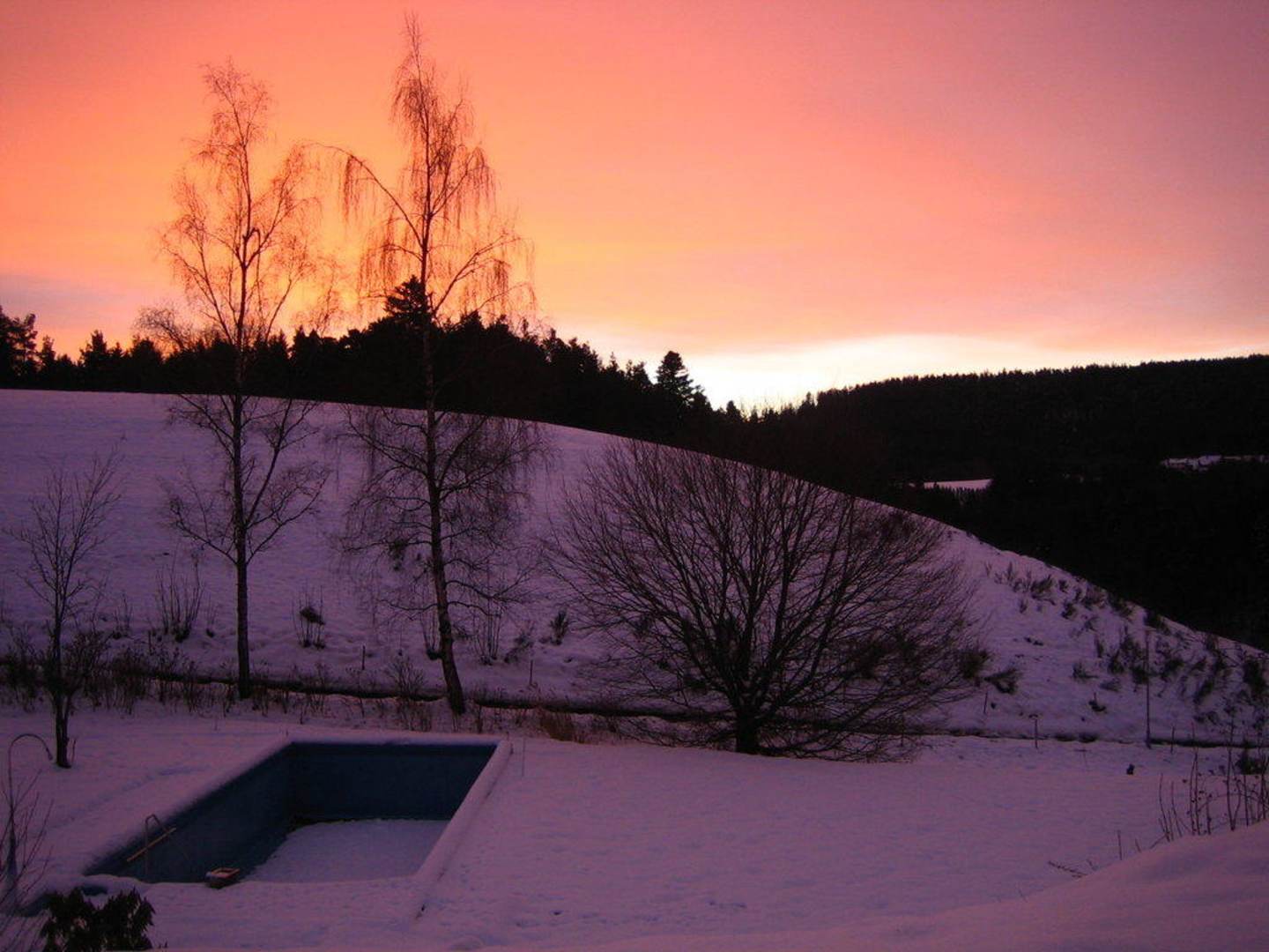 Blick von der Terrasse: Sonnenaufgang in Winterlandschaft