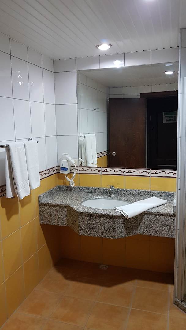 Großzügiges Waschbecken genug Platz für alle Kosmetika. Mit Föhn und weiterer Steckdose.