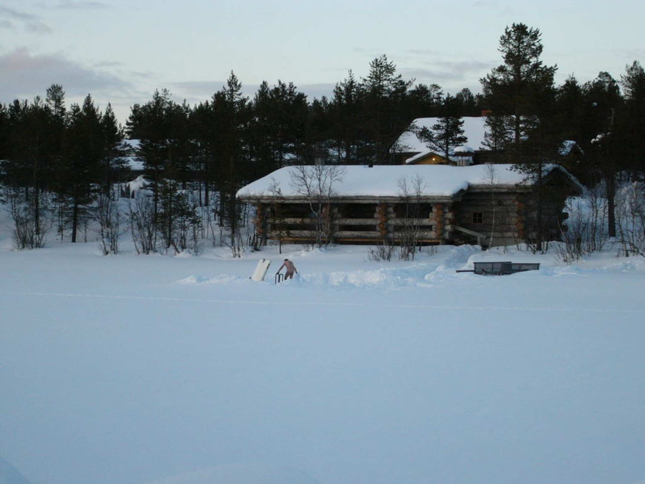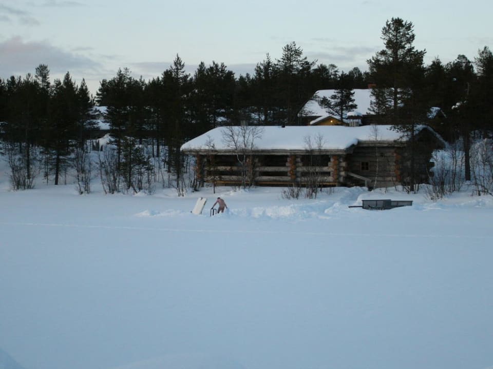 das davor ist ein im Winter zugefrorener See. Im See befindet sich ein Eisloch, das zum Abkühlen nach der Sauna genutzt wird - spektakulär!