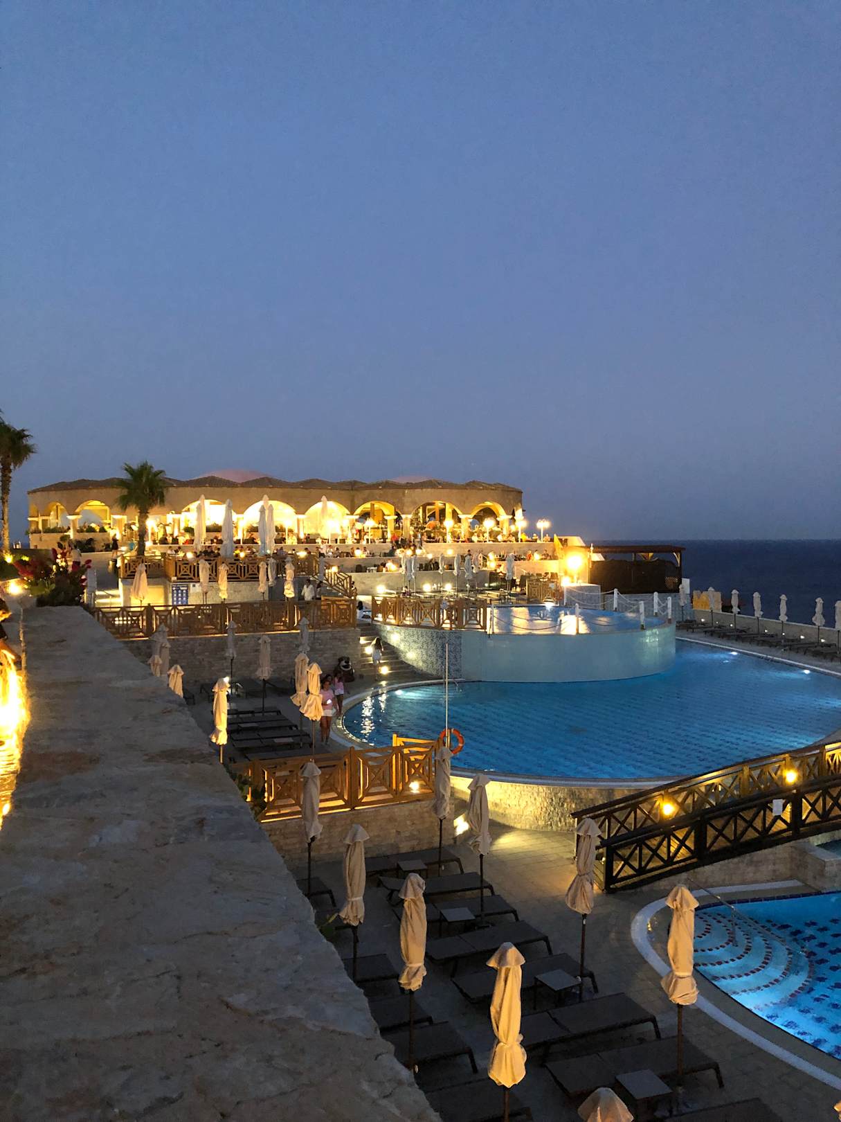 AusblickAuf dem Weg zum Abendessen sieht man diesen wunderschönen Ausblick auf die 3 Pools, das Restaurant an sich und das Meer.