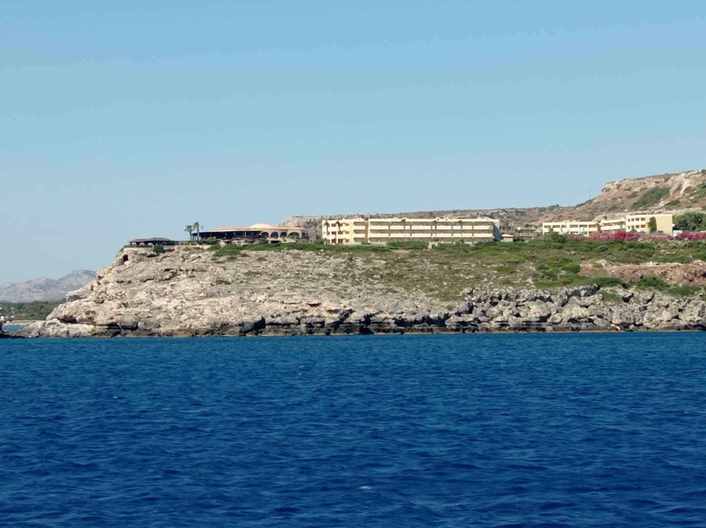 Teil der Hotelanlage bei einem Tauchtrip vom Meer aus fotografiert.