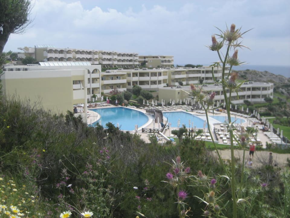 Sicht auf das Hotel und die Garten- und Poolanlage