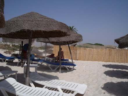 Strand mit Liegen und Sonnenschirmen