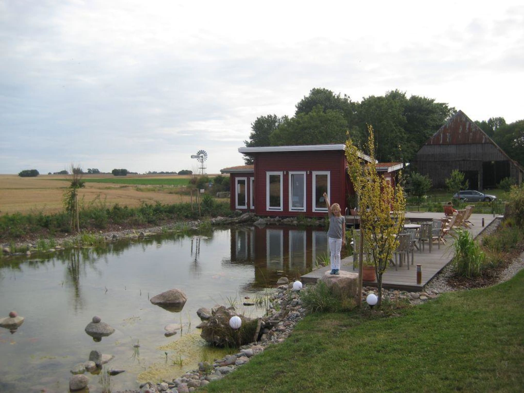 Blick vom Hotel über den Schwimmteich zum Saunahäuschen