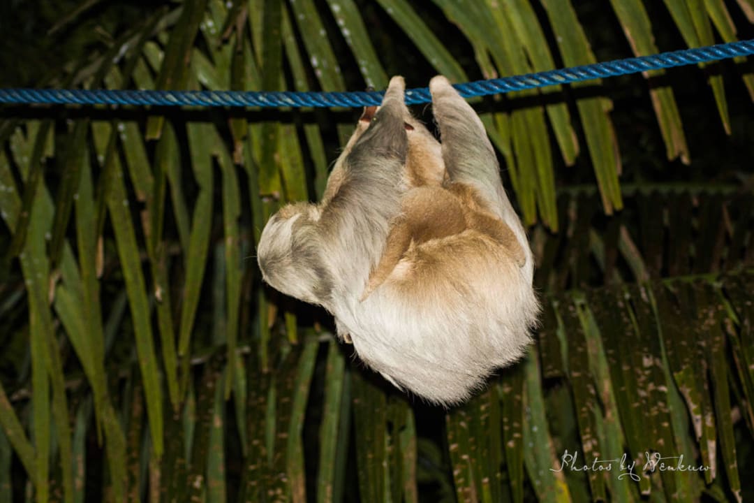Faultier mit Jungen hängt über der Straße