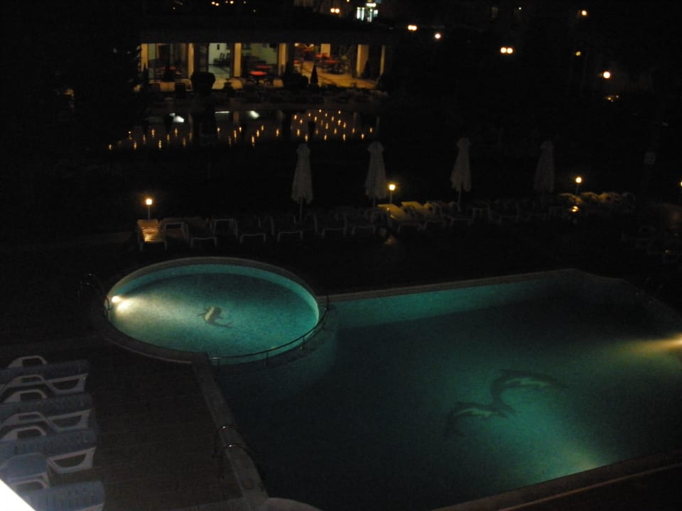 Blick vom Balkon auf den Pool bei Nacht