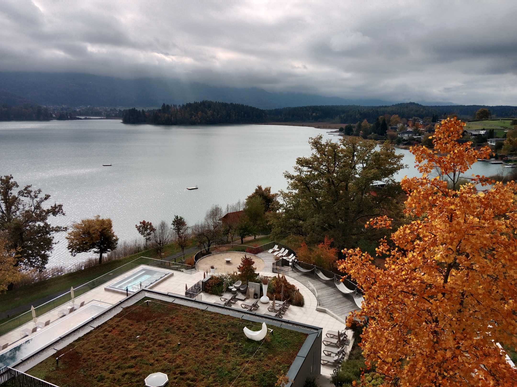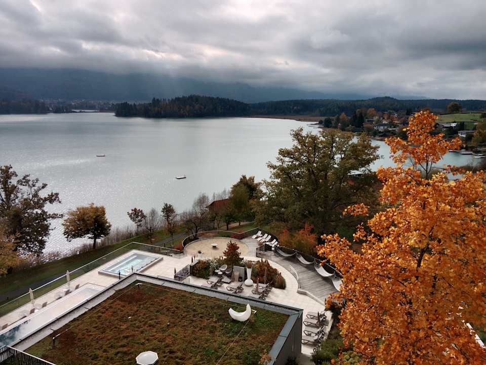 Ausblick vom Zimmer auf Pool und See