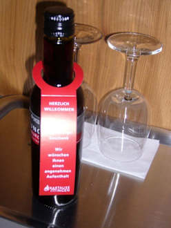 Eine kleine Flasche Rotwein als Willkommensgruß in der Kartause Ittingen