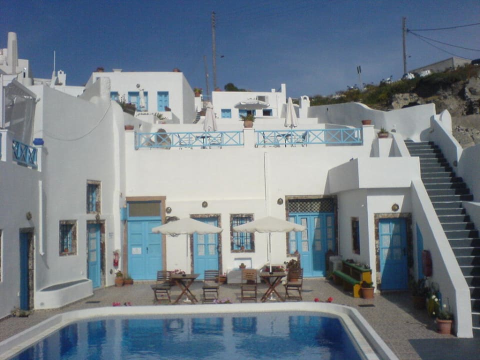 Blick vom Pool auf die beiden oberen Zimmer (oberes Bilddrittel), unseres war das rechte; ganz links oben sieht man einen kleinen Teil des Nachbarhotels, wo die Baustelle war