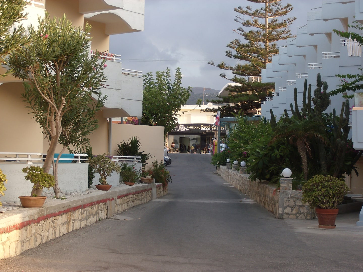 Weg von der Hotelanlage zur Straße. In der Anlage ist es ruhig, man hört keinen Lärm. In der Einkaufsstraße gibt es einige Geschäfte, Souvenierläden, Restaurants, Bars, Supermärkte. Zum Hotel gehört ein kleiner Laden, zu empfehlen.