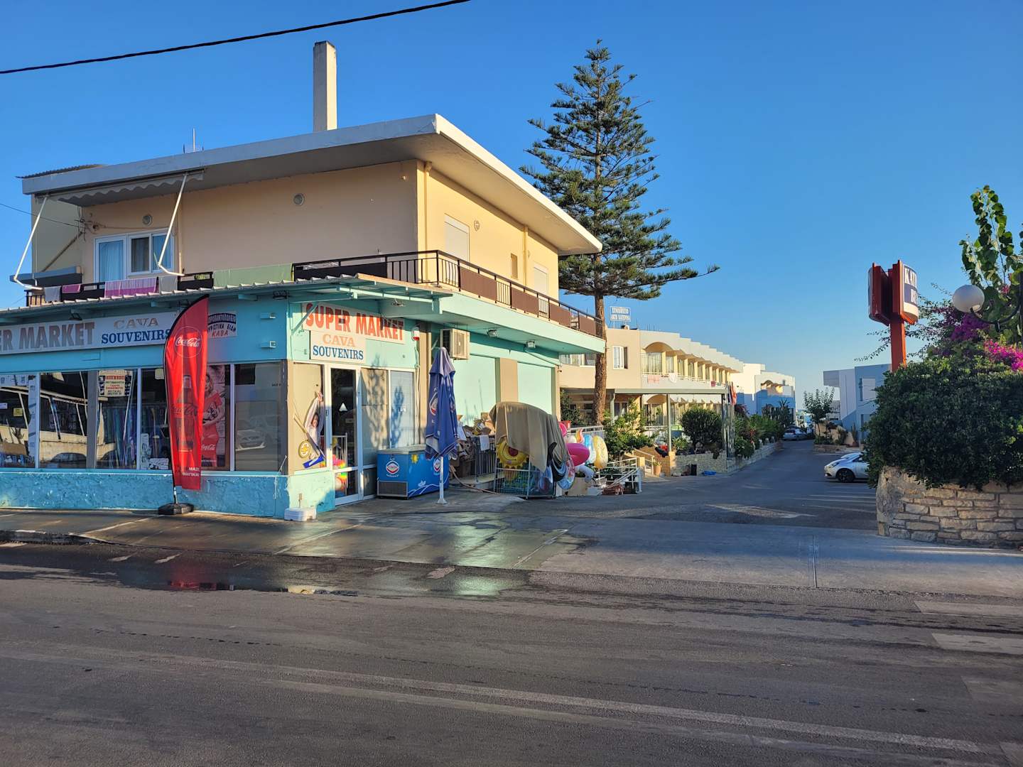 Zufahrt zum Hotelgebäude mit angrenzendem Supermarkt