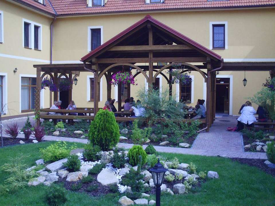 Innenhof des Hotels Kazduv Dvur mit überdachtem Sitzbereich